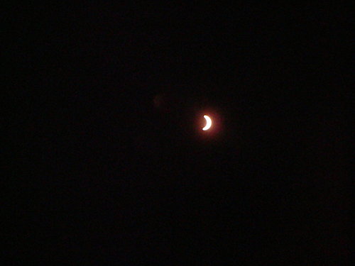 一早到公司就看到同事在說用二片磁碟片就可看日偏食, 果然出去一看就看到同事仰著頭, 拿著磁碟片望向天空, 接著又有同事拿著光碟祼片來看天空, 二樣都可以看的很清楚日偏食, 磁碟片看到的是像暗房的影像, 光碟片看到的較明亮, 圖如下嘍.